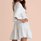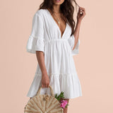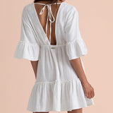 Leisure coverup dress featuring flare long sleeves, lace crocheted details splicing. All white for your relaxed holiday.