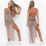 Easy and sexy sheer coverup dress featuring deep v neckline and low scoop back, spaghetti shoulder straps, acrylic fabric, and split high thigh sides. A cover up for your wonderful beach trip.